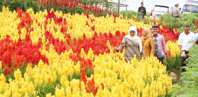 Khofifah lalu menyusuri area yang dipenuhi aneka tanaman pangan, beragam bunga, dan hortikultura. Melihat hamparan bunga celosia, Khofifah langsung berfoto di tengah taman bunga yang berwarna-warni.