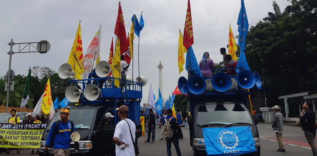 Dua mobil komando berisi sound system dan bendera dari berbagai aliansi serikat buruh telah siap digunakan untuk beraksi di ke arah Patung Kuda Monas.