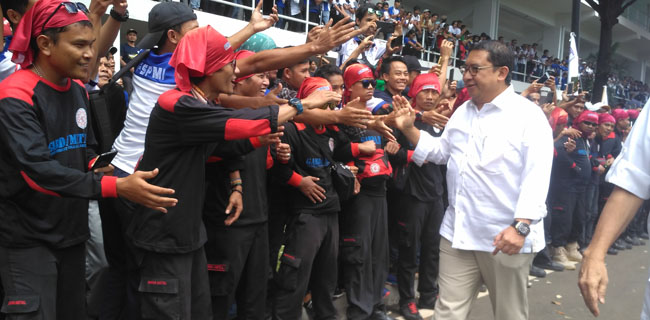 Kantor Berita Politik RMOL di lokasi, Fadli Zon tiba sekitar pukul 11:45 WIB. Fadli disambut ribuan buruh yang hadir.