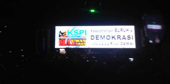 Hingga saat ini, Prabowo Subianto masih berorasi di depan ribuan buruh di peringatan May Day ini. []
