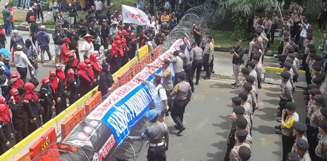 Ratusan buruh yang tergabung dalam Federasi Serikat Pekerja Aneka Sektor Indonesia (FSPASI) mulai coba merangsek masuk kedalam barikade penjagaan personel kepolisian usai mereka tidak diperbolehkan masuk sampai Taman Pandang depan Istana Negara.