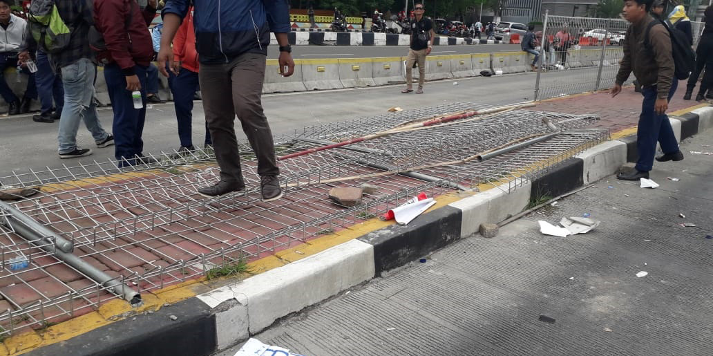 longmarch dari Bundaran HI bergabung dengan massa serikat buruh lainnya. Dampak dari keributan kecil depan Halte Transjakarta Tosari, pagar halte sempat rusak.