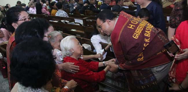 Anies yang datang pukul 18.30 WIB disambut jemaah Gereja dengan suka cita dan nyanyian pujian yang dibawakan oleh paduan suara Gereja