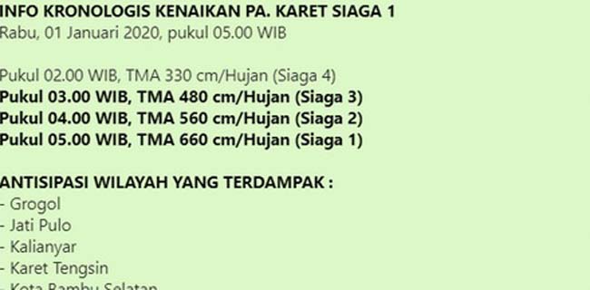 Saat ini, beberapa pintu air sudah mencapai Siaga 2 dan 3. Seperti pintu air Karet yang terpantau sudah memasuki Siaga 1 dengan tinggi muka air 660 cm, pada 05.00 WIB. Dan pintu air Pulo Gadung yang sudah memasuki Siaga 2 tinggi muka air 730 cm pada waktu yang sama.