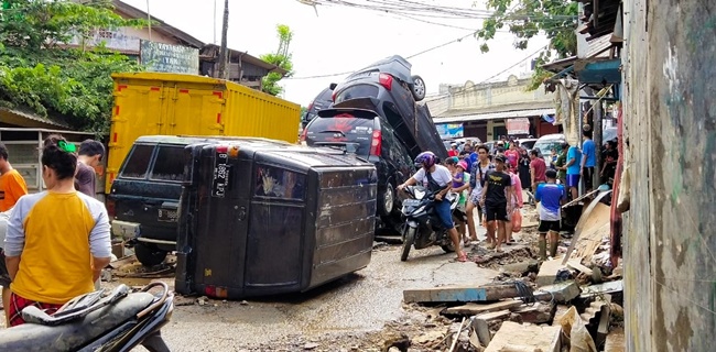 Puluhan kendaraan milik warga pun terlihat hancur serta tak beraturan posisinya. Banyak kendaraan yang bertumpukan akibat terbawa derasnya arus.