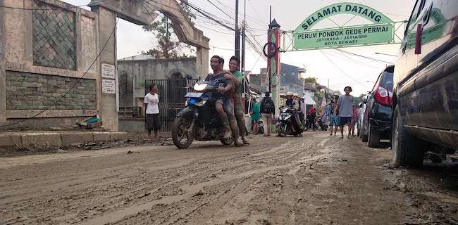 Belasan kendaraan sepeda motor terjatuh saat melintas akses jalan utama Perumahan Pondok Gede Permai, Jatiasih, Kota Bekasi, Jumat (3/1) sore.