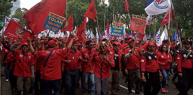 Dalam aksinya kali ini, para buruh menyuarakan penolakan terhadap Omnisbus Law RUU Cipta Lapangan Kerja yang digagas oleh pemerintah.