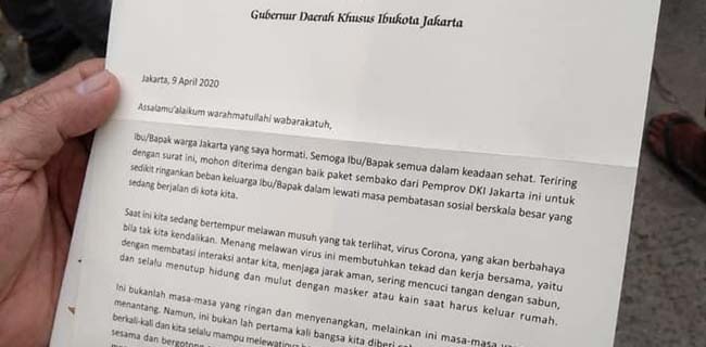 "Ibu/bapak warga Jakarta yang saya hormati. Semoga ibu/bapak semua dalam keadaan sehat. Teriring dengan surat ini, mohon diterima dengan baik paket sembako dari Pemprov DKI Jakarta ini untuk sedikit ringankan beban keluarga ibu bapak dalam melewati masa Pembatasan Sosial Berskala Besar (PSBB) yang sedang berjalan di kota kita," demikian bunyi surat yang ditulis Anies Baswedan tertanggal (9/4).