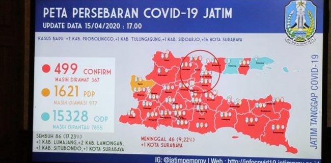 “Hari ini ada tambahan 25. Total yang sudah terkonfirmasi positif menjadi 499 orang,†kata Gubernur Jawa Timur, Khofifah Indar Parawansa dalam jumpa pers di Gedung Negara Grahadi, Surabaya, Rabu, (15/4) seperti dikutip dari