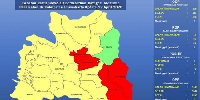 update perkembangan warga Purwakarta yang terpapar Covid-19 hingga hari ini, Senin (27/4), adalah ODP sebanyak 159 orang, PDP 14 orang, dan positif 8 orang.