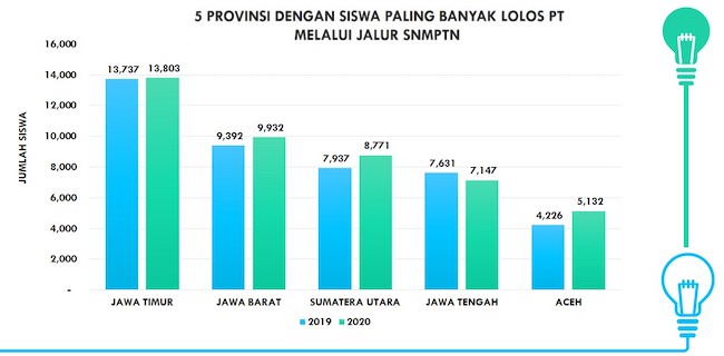 Tahun ini, dari 96.496 siswa yang diumumkan lulus dan masuk 86 Perguruan Tinggi Negeri (PTN) se-Indonesia, sebanyak 13.803 di antaranya berasal dari Jawa Timur. Angka ini naik dari tahun 2019 lalu sebanyak 13.737 yang lolos SNMPTN.