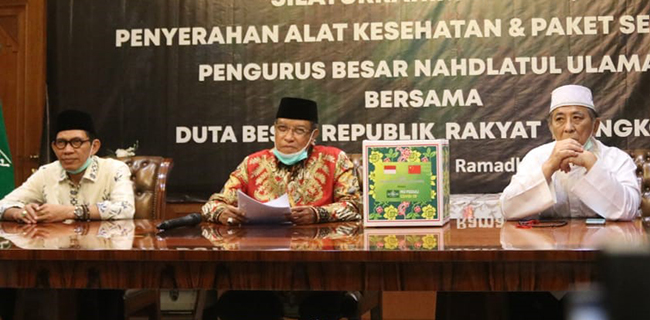 Pada situasi pandemik, kata pengasuh pondok pesantren Al-Tsaqofah Ciganjur, Jakarta, Selatan ini. Tiongkok membantu PBNU sebanyak 300 alat pelindung diri (APD), 1.920 alat rapid test, 16.000 masker. Serta 1000 paket sembako.