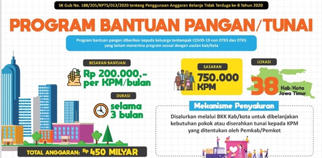 “Kami menyiapkan dana bantuan keuangan khusus senilai Rp 549,9 miliar untuk sebanyak 750.000 KPM yang belum mendapat intervensi dari pusat. Mereka akan dibantu Pemprov Jatim berupa bantuan tunai Rp 200 ribu per bulan selama tiga bulan ke depan,†papar Gubernur Khofifah.