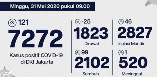 Berdasarkan data hari ini, Minggu (31/5), kasus positif Covid-19 di Ibukota bertambah 121 orang, sehingga total keseluruhan kasus menembus 7.272 orang.