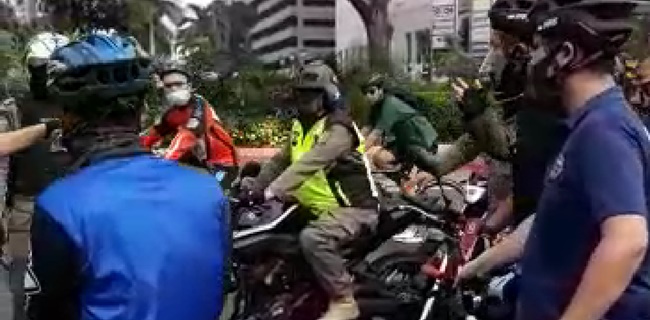 Saat akan melanjutkan perjalanan dari bundaran HI menuju SCBD, tiba-tiba seorang oknum Satpol PP yang menunggangi sepeda motor dan berrompi loreng serta sticker bintang berwarna kuning di helmnya mencoba mendorong Dimas masuk ke lajur lambat dengan cara memepetkan sepeda motornya.