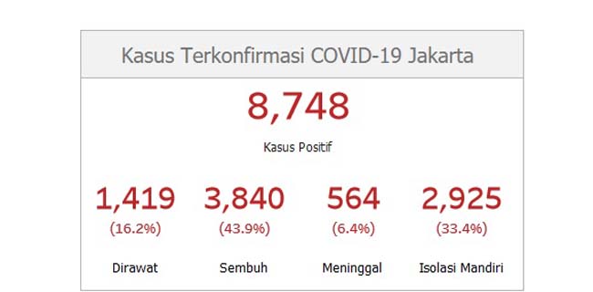 Dengan tambahan itu, jumlah kumulatif kasus positif di wilayah DKI Jakarta sebanyak 8.748 kasus.