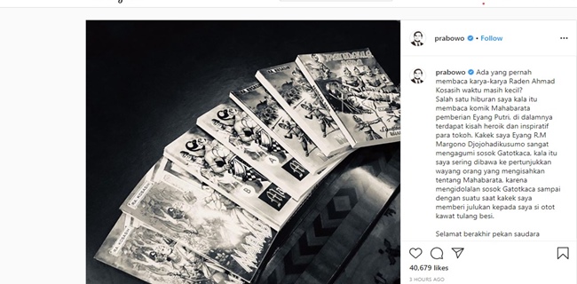"Salah satu hiburan saya kala itu membaca komik Mahabarata pemberian Eyang Putri. Di dalamnya terdapat kisah heroik dan inspiratif para tokoh," tulis Prabowo.