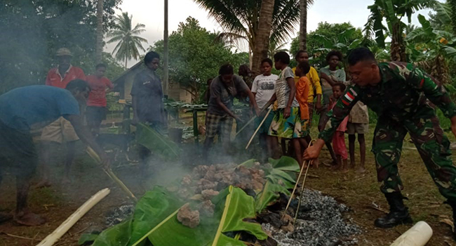 “Personel Pos Kondo yang dipimpin oleh Danpos Letda Inf Ulivo Dicky Pambudi, menggelar acara bakar batu bersama warga Kampung Kondo, Distrik Naukenjerai, Sabtu sore (13/6),†kata Mayor Rizky dalam keterangannya.