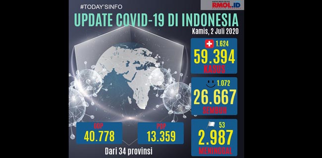 "Dari pemeriksaan ini kita mendapatkan kasus baru konfirmasi Covid-19 sebanyak 1.624 orang, sehingga akumulasinya 59.394 orang hasil positif," ujar Achmad Yurianto dalam jumpa pers di Gedung Graha BNPB, Jakarta Timur.