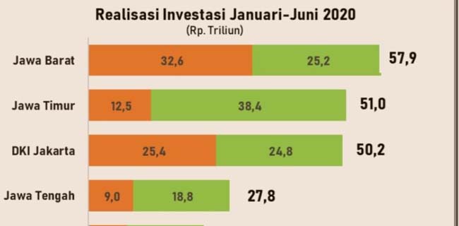 Berdasarkan data rilis resmi BKPM RI, pada periode Januari–Juni 2020 ini, total investasi (PMA dan PMDN) di Jatim senilai Rp 51 triliun yang terdiri dari PMA sebesar Rp 12,5 triliun, dan PMDN sebesar Rp 38,4 triliun.