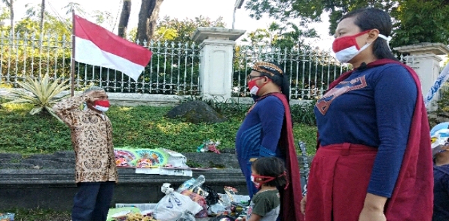 Rasa haru dengan mata memerah menahan tangis, mbah Min Semprong, begitu dirinya biasa disapa, tetap bersemangat mengikuti upacara Kemerdekaan RI yang digelar secara sederhana di Bolevard UNS Solo tepat pukul 10.15 WIB yang diikuti pasangan Super Hero Spiderman dan Wonder Women dan juga pedagang kaki lima yang biasa berdagang di kawasan tersebut.