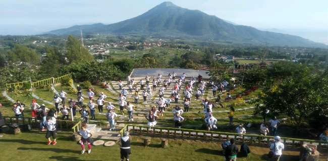 latar pemandangan Gunung Merbabu serta dikelilingi perbukitan, senam