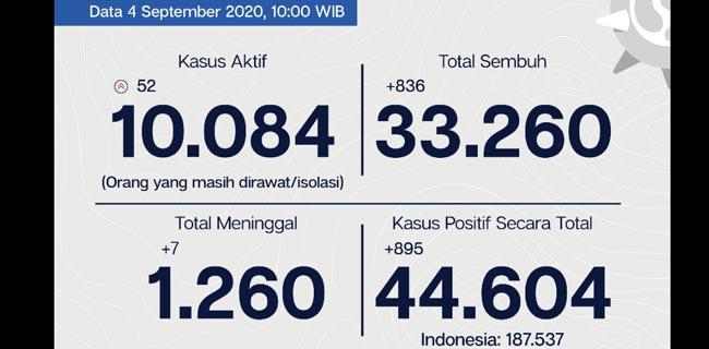 Dengan demikian, berdasarkan data dari corona.jakarta.go.id‬ jumlah kasus terkonfirmasi secara total di Jakarta sampai hari ini sebanyak 44.604 kasus.