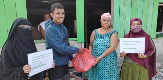 Dalam membagikan sembako, relawan langsung mendatangi satu persatu target penerima manfaat untuk menghindari kerumunan dan tetap menjaga protokol saat berkegiatan.