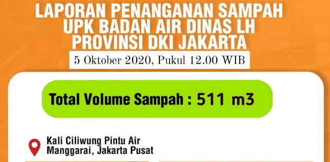 Dinas Lingkungan Hidup (DLH) Provinsi DKI Jakarta pun langsung bekerja membersihkan sampah yang terbawa aliran air. Hingga Senin siang (5/10), setidaknya ada 511 meter kubik sampah yang diangkut DLH DKI Jakarta.