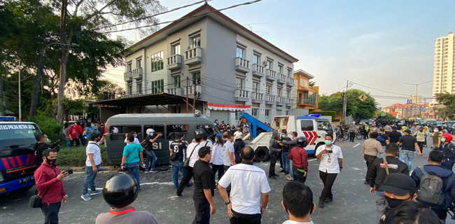 Sebelum dipikul mundur, massa aksi terlihat melempari petugas, dan melakukan pengrusakan satu unit mobil polisi.