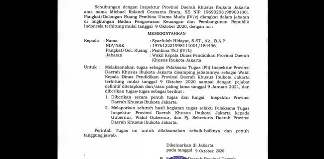 "Diberikan secara penuh tugas dan fungsi Inspektur Provinsi DKI Jakarta serta melaporkan seluruh hasil kegiatan tugas selaku Plt Inspektur DKI Jakarta kepada Gubernur, Wakil Gubernur, dan Pj. Sekretaris Daerah Provinsi," demikian bunyi surat perintah tugas yang diteken Sri pada 9 Oktober kemarin.