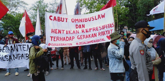 Terlihat mahasiswa membawa spanduk besar bertuliskan "Penolakan Omnibus Law dan hentikan represifitas terhadap gerakan rakyat", sambil berorasi.