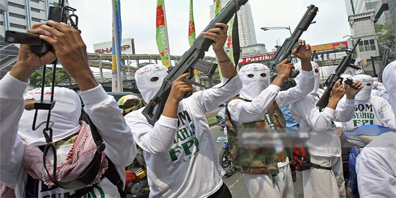 Dalam foto itu, beberapa orang mengenakan penutup kepala berwarna putih dengan logo Laskar Pembela Islam (LPI) tengah menodongkan senjata laras panjang ke udara.