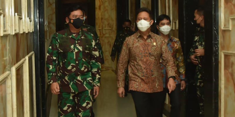 Didampingi Asops Panglima TNI Mayjen TNI Tiopan Aritonang, Kapuskes TNI Mayjen TNI Tugas Ratmono. Marsekal Hadi menyambut Budi Gunadi yang dayang bersama Wamenkes Dante Saksono Harbuwono dan rombongan.