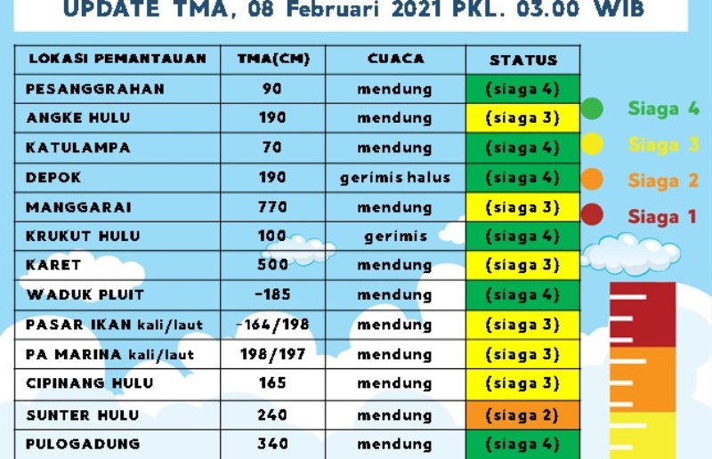 Beberapa pintu air berstatus siaga 3 diantaranya Angke Hulu 190 cm, Manggarai 770 cm, Karet 500 cm, pasar ikan kali 164 dan laut 198 cm, PA Marina kali/laut 198 dan 197 cm dan Cipinang Hulu 165 cm.