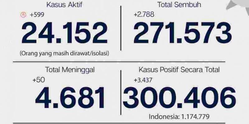Sedangkan jumlah kasus terkonfirmasi pada hari bertambah 3.438 orang. Dengan demikian secara total positif Covid-19 di Jakarta sampai hari ini sebanyak 300.406 kasus.