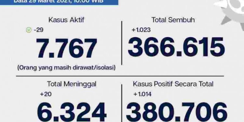 Kantor Berita RMOLJakarta, jumlah total kasus tersebut, sebanyak 366.615 orang dinyatakan telah sembuh atau naik 1.023 orang dengan tingkat kesembuhan 96,3 persen.