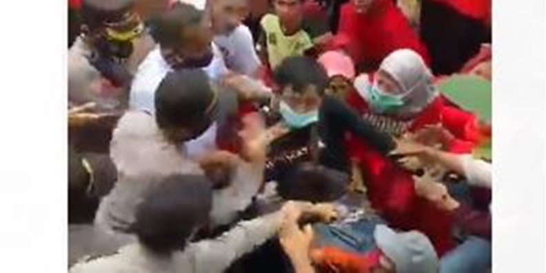 Dalam potongan video itu, tampak puluhan masyarakat bersitegang dengan aparta kepolisian. Bebebrapa peserta wanita menjerit histeris, menangis tatkala melihat peserta lain didorong hingga dipukul.