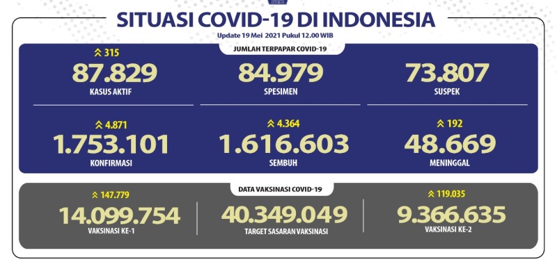 Data Satuan Tugas virus corona baru Satgas (Covid-19) hingga Rabu (19/5) pukul 12.00 WIB, kasus masyarakat terjangkit bertambah 4.871 kasus.