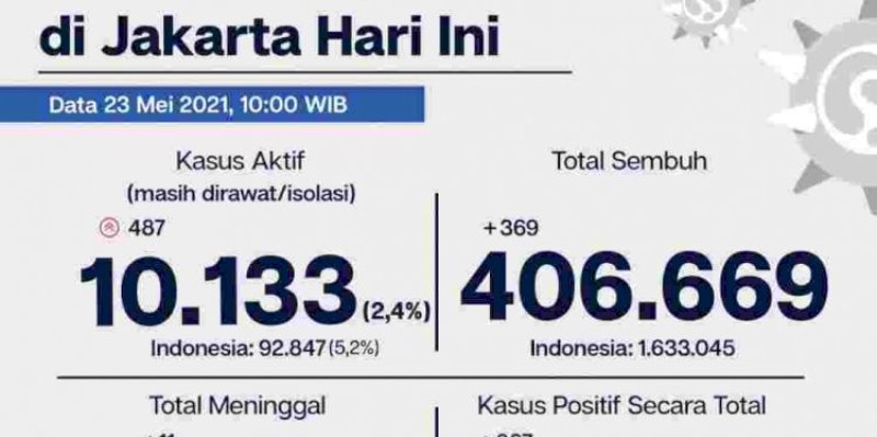 Kantor Berita RMOLJakarta, data Pemerintah Provinsi per Minggu (23/5), kasus aktif Covid-19 di Jakarta pada hari ini naik sebanyak 487 kasus, sehingga jumlah orang yang masih dirawat/isolasi sampai hari ini sebanyak 10.133 orang.