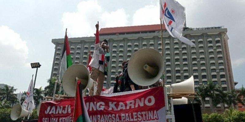 Indonesia Worker Solidarity for Free Palestine' dan bendera Palestina.