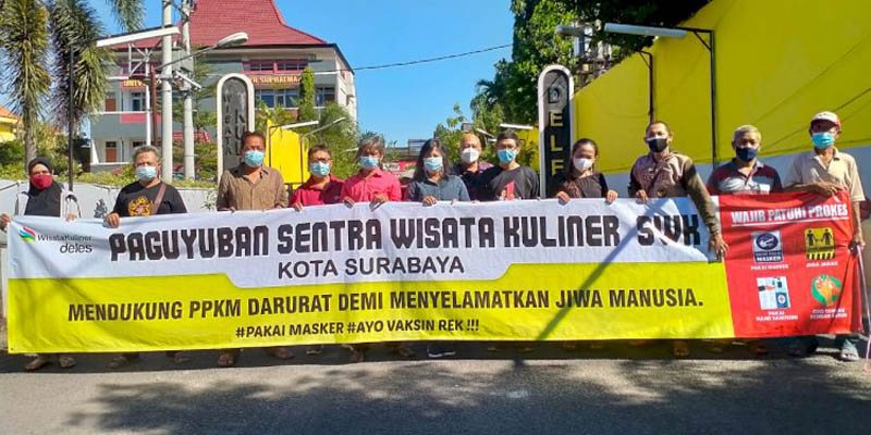 Aksi dukungan itu diapresiasikan melalui banner yang bertuliskan "Paguyuban Sentra Wisata Kuliner Kota Surabaya Mendukung PPKM Darurat Demi Menyelamatkan Jiwa Manusia', yang dibentangkan di area SWK Deles, Jalan Arief Rahman Hakim Surabaya, Sabtu (24/7).