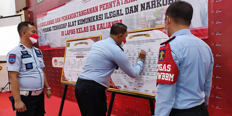 Pernyataan komitmen juga diucapkan oleh Petugas Lapas Kalianda yang dibacakan oleh Ka. KPLP, Iwan Patra, yang dilanjutkan dengan penandatanganan komitmen bersama oleh Ka. KPLP, Kasi Administrasi Kamtib, Afan Sulistiono, dan Kepala Regu Pengamanan 3 dan 4 yaitu Zikron dan Arbain.