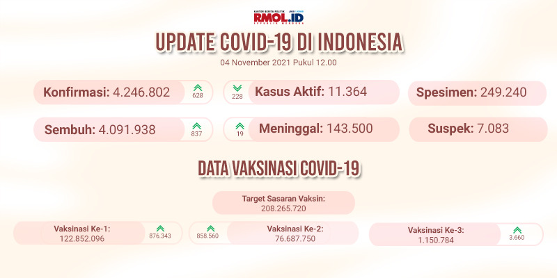 Meski demikian, kasus terkonfirmasi positif juga mengalami penambahan sebanyak 628 kasus, sehingga totalnya kini sudah ada 4.246.802 kasus konfirmasi sejak awal pandemi tahun 2020 silam.