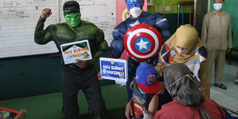 Salah satunya, menghadirkan tokoh superhero Hulk dan Captain America di area pelaksanaan vaksinasi.