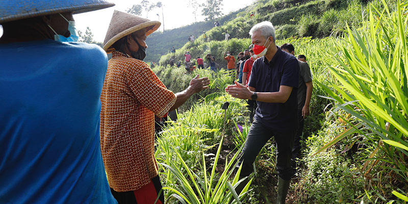 Ganjar bersama kelompok tani (poktan) menanam berbagai jenis pohon di salah satu lereng tebing. Antara lain pohon jati, sengon, alpukat, gayam, aren, durian, cempedak, serta gaharu.