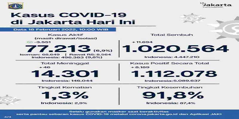 "Kami turut mengimbau agar masyarakat juga mewaspadai penularan Varian Omicron yang kini juga meningkat di Jakarta. Upaya 3T terus digalakan, selain vaksinasi Covid-19 yang juga masih berlangsung dengan cakupan yang lebih luas," pungkasnya.