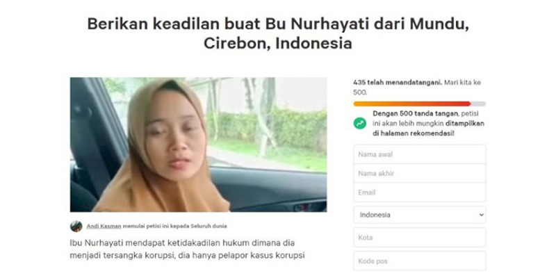 Dalam petisi berjudul "Berikan keadilan buat Bu Nurhayati dari Mundu, Cirebon, Indonesia" yang dibuat akun Andi Kasman, telah ada lebih dari 400 orang yang mendukung dengan memberikan tanda tangannya.