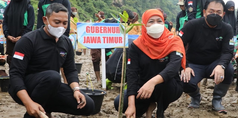 Pada tahun 2021, jelas Khofifah, Pemprov Jatim telah melakukan penanaman mangrove seluas 42,75 hektar atau sebanyak 136.600 batang di Kabupaten Gresik, Pasuruan, Probolinggo, Banyuwangi, dan Bangkalan.