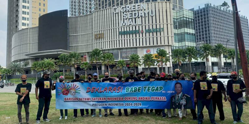 Belasan simpatisan dari Barisan Betawi Satukan Indonesia Dukung Andika Perkasa (Babe Tegap) berkumpul di depan Green Sedayu Mall, Cengkareng, Jakarta Barat, Senin (14/3). Mereka mendeklarasikan dukungannya kepada Panglima TNI Jenderal Andika Perkasa untuk menjadi Calon Presiden Indonesia pada 2024.